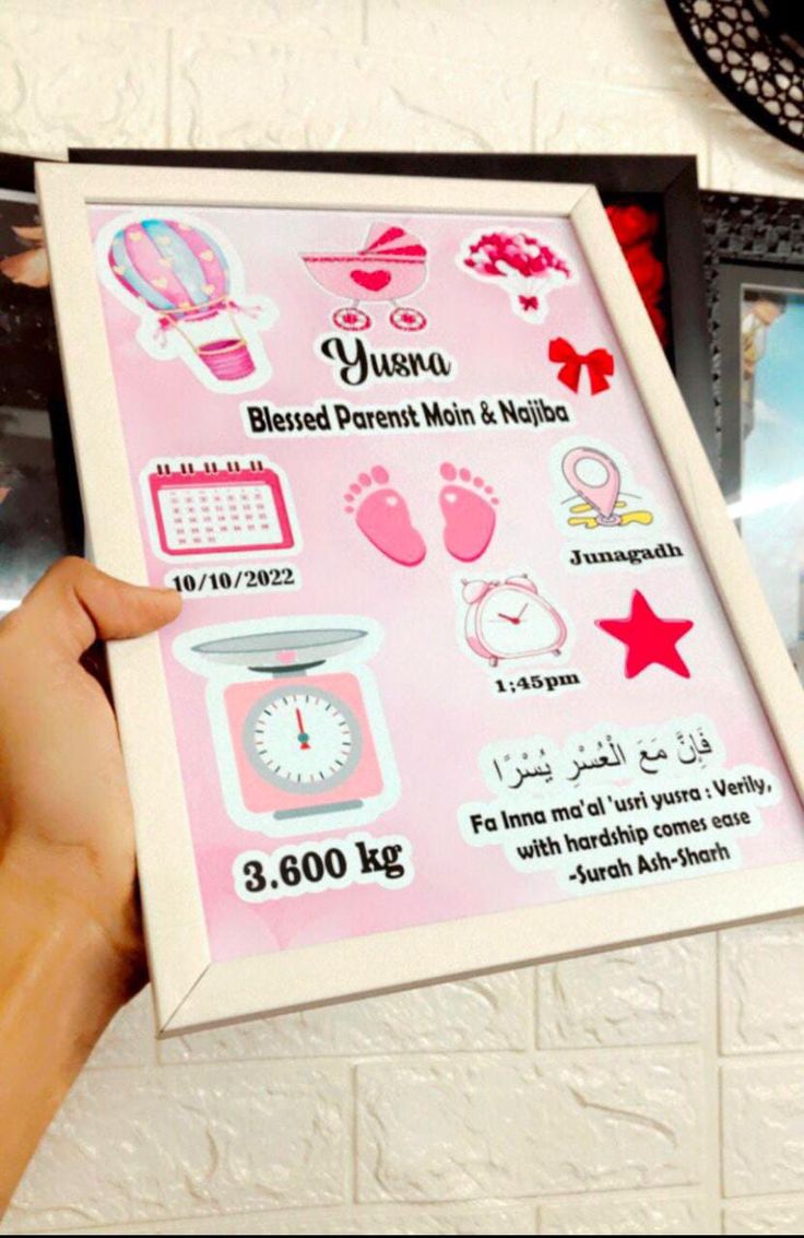 تابلو مشخصات تولد نوزاد از بهترین پروفیل موجود 2x2 ساخته شده است که کیفیت و ماندگاری محصول را تضمین می کند. کلیه ی قاب های مجموعه دارای شیشه و آویز (جهت نصب روی دیوار) می باشند.